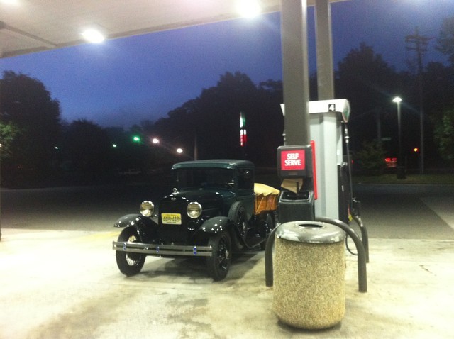 ⇐Day 1 | Day 3⇒ Filling up in the early morning right outside the entrance to Skyline Drive. Before the trip each fuel stop was planned out. This was to save time and to avoid going up and down long mountain passes just to find fuel. We were hoping to get better fuel economy but planned for 15 MPG and no more than 150 miles between fuel stops. With an 11 gallon tank (filled right to the filler neck) there was just a little reserve. Sunrise on Skyline Drive - it only takes about 3 hours to drive Skyline Drive when not stopping much. There were quite a few people up there to see the sunrise. The Blue Ridge Parkway starts right at the end of Skyline Drive. It can be thought of as a continuous road; the only difference is that Skyline Drive is in Shenandoah National Park and has an entrance fee. A special treat was the Olive Loaf lunchmeat - we had not had that in many years and it brought back good memories of stopping for a picnic lunch on the side of the road on the way to the Jersey Shore. (Now of course that seems ridiculous to do...) At this lunch stop we met a few people who wanted to take pictures. One of them had a Model A and wanted to know if the green color was stock (it is - Rock Moss Green, for commercial vehicles). The funny thing was when seeing the NJ license plate he said that he knows that some people will really take the Model A's on long trips and we thought - yeah, we are right here! :-) These pictures were taken by Mark at Lostknight Images who graciously shared them with us.